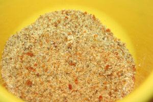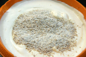 Cukier rozpuścić w rondlu i wsypać orzechy włoskie. Wymieszać i zdjąć z ognia. Rozłożyć na blasze i pozostawić do ostygnięcia. Orzechy przełożyć do blendera i drobno zmielić. Połowę chrupiących orzechów włożyć do kremu. Druga połowa posłuży do dekoracji ciasta.