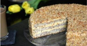 Aby przygotować syrop, należy podgrzać wszystkie składniki w rondelku. Po dokładnym połączeniu ochłodzić. Na podstawce położyć pierwszą warstwę ciasta. Posmarować syropem, a następnie 1/3 kremu. Położyć kolejną warstwę i postąpić w analogiczny sposób. Na koniec posmarować górę i boki ciasta. Posypać orzechami z każdej strony.