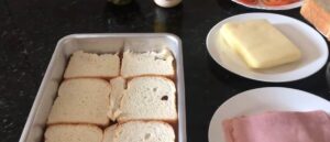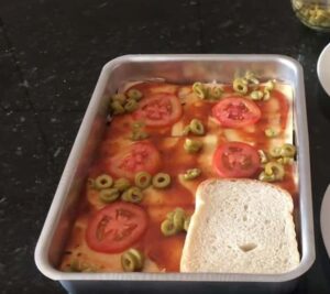 Kromki chleba tostowego ułóż na dnie naczynia do pieczenia, następnie posmaruj je starannie majonezem, ułóż przygotowane wcześniej składniki czyli szynkę, ser, oliwki i pomidory, a następnie ponownie ułóż chleb.