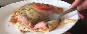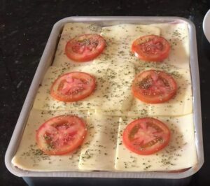 Te warstwy ponownie posmaruj majonezem i ułóż następnie taką samą warstwę jak ta dolna, po czym dodatkowo połóż pokrojony w krążki pomidor, a także plastry sera. Posyp oregano. Gotowe.