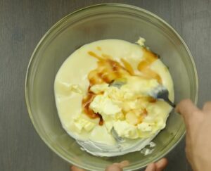 3. Do dużej miski włóż masło, które ma temperaturę pokojową , następnie dodaj do niego olejek waniliowy oraz mleko skondensowane.