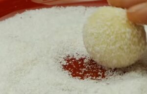 7. Otrzymane kuleczki obtocz w pozostałych wiórkach kokosowych.