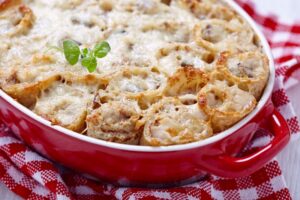 7. Na mniejsze kawałki pokrój każdy rulon, po czym włóż je do naczynia żaroodpornego lub na blaszkę do pieczenia. Całość zalej kwaśną śmietaną.
