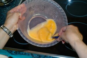 1. Do miski wbij 5 jajek, po czym widelcem lub trzepaczką połącz je ze szczyptą cukru.