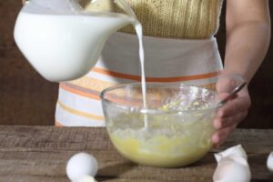 3. Następnie powoli wlej mleko i olej. Dokładnie mieszaj przez kilka minut. Konsystencja ciasta powinna być gęsta.