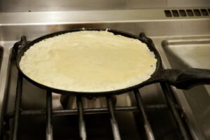 4. Na patelni rozgrzej niewielką ilość oleju. Następnie za pomocą głębokiej chochli wlej przygotowane ciasto i rozprowadź je po całej powierzchni nagrzanej patelni. Smaż przez chwilę z każdej strony. Najlepiej nadaje się specjalna patelnia do naleśników.