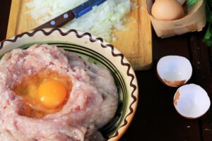 1.  Na samym początku zacznij przygotowywać mięso. Przełóż je do miski, po czym dodaj jajko. Całość przypraw solą oraz pieprzem. Dokładnie połącz ze sobą składniki. Dla lepszego smaku dodaj do mięsa drobno pokrojoną cebulkę. Najlepiej, aby przygotowany farsz był nieco pikantny.