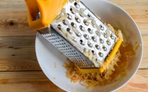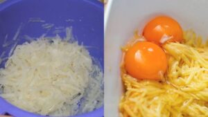 2.  Następnie obierz oraz umyj ziemniaki, po czym dokładnie zetrzyj je za pomocą tarki na średnich oczkach. Koniecznie pozostaw starte ziemniaki na kilka minut. Po tym czasie wylej całą wodę , a otrzymaną masę dokładnie wyciśnij.