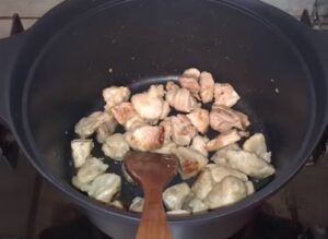 1. Na rozgrzanym oleju podsmaż pokrojone w kosteczkę mięso wieprzowe.