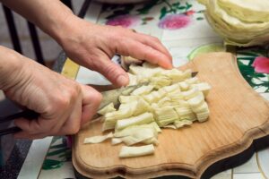 2. Za pomocą tarki zetrzyj obraną marchew, po czym pokrój w piórka obraną cebulę. Ostrym nożem poszatkuj kapustę.