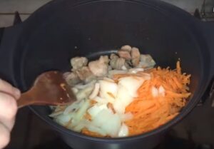 3. Do podsmażonego mięsa dodaj cebulę oraz marchew. Całość smaż do miękkości warzyw. Tak przygotowane przełóż do garnka.