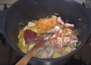 4. Na mniejsze kawałki pokrój wędzone żeberka. Pokrojone mięso przełóż także do garnka. Całość przypraw szczyptą soli oraz dodaj koncentrat pomidorowy. Dokładnie całość wymieszaj.