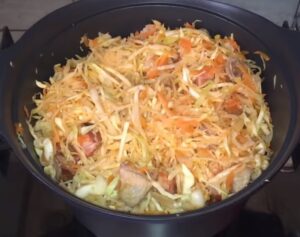9. Całość bardzo dokładnie pomieszaj, po czym przykryj garnek i gotuj jeszcze 10 minut na małym ogniu. Po tym czasie pyszny bigos jest gotowy!