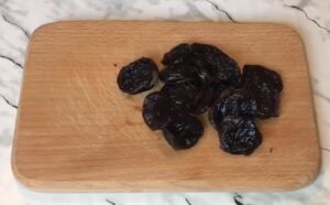 7. W misce zaparz suszone śliwki wrzątkiem. Następnie pokrój na mniejszą kosteczkę,
