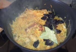 8. Po około 30 minutach dodaj do garnka pieprz, liście laurowe, śliwki oraz kolendrę.