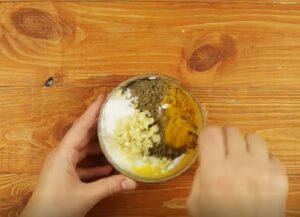 3. Do dużej miski przełóż jogurt naturalny, po czym dodaj drobno posiekany czosnek, przyprawy oraz wyciśnięty sok z cytryny.