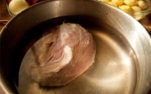 1. Na samym początku dobrze umyj mięso, następnie przełóż go do garnka i zalej wodą. Gotuj na dużym ogniu. Gdy pojawią się szumowiny zdejmij je i dodaj jedną cebulę oraz jedna marchew. Tak przygotowane składniki gotuj około 60 minuty na mniejszym gazie. Po tym czasie wyjmij mięso z garnka.