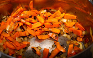 2. W między czasie obierz pietruszkę, seler naciowy marchew, cebula i pokrój na paseczki. Tak przygotowane warzywa podsmażaj na rozgrzanej patelni z dodatkiem masła lub smalcu.