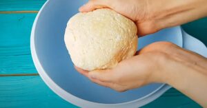 Do twarogowej masy dodaj przesianą połowę mąki oraz proszek do pieczenia, po czym wszystko wymieszaj. Wyrabiaj ciasto, powoli wsypując pozostałą ilość mąki w ilości zależnej od potrzeb.