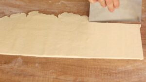 Kiedy ciasto będzie gładkie i zwarte, podziel je na dwie części. Każdą rozwałkuj na kształt prostokąta o grubości 2–3 cm, a następnie przytnij postrzępione krawędzie.