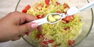 1. Poszatkuj na drobno kapustę, po czym rękoma lekko ugniataj. Następnie umyj pomidory, które pokrój w ósemki.