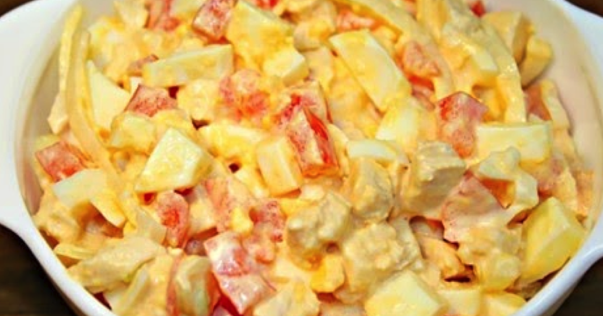 Ugotować jajka na twardo. W międzyczasie umyć pomidora i pokroić w kostkę. Kurczaka przyprawić, ugotować/ upiec. Odstawić do wystudzenia, pokroić w kostkę. Ugotowane jajka pokroić w kostkę. Cebulę pokroić w piórka, wymieszać z cukrem i octem- odstawić na chwilę do zamarynowania.