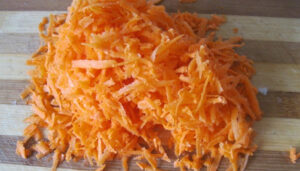 Marchewki obieramy i ścieramy na tarce o dużych oczkach.
