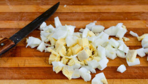 Jajka gotujemy na twardo. Po ugotowaniu poczekaj aż przestygną. Następnie obieramy jajka ze skorupki i kroimy w kostkę.
