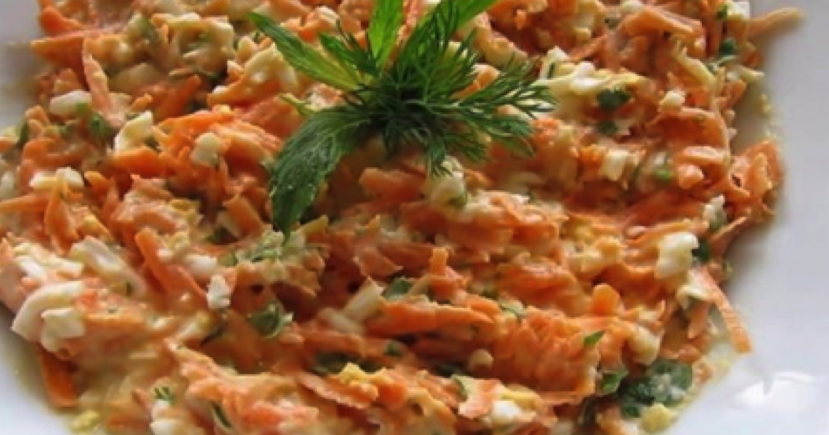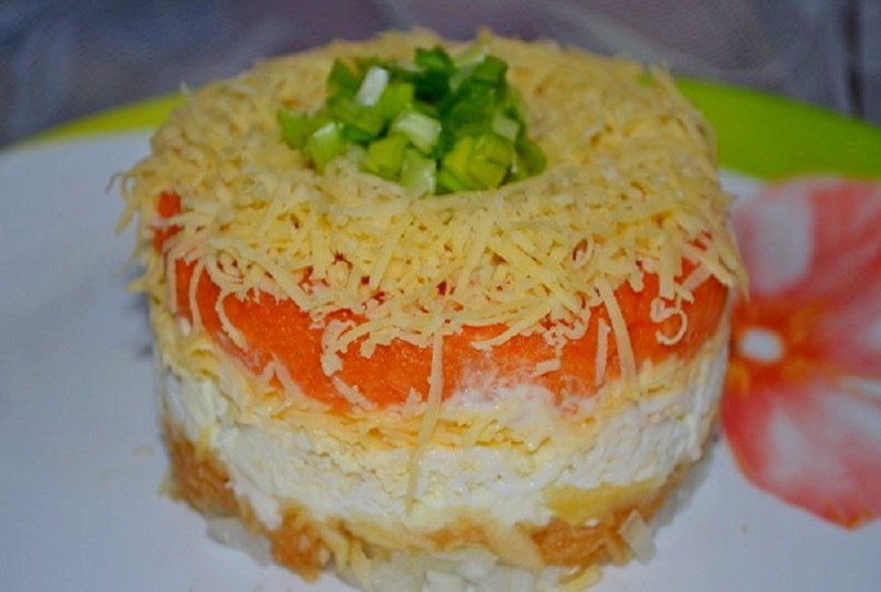 Sałatkę układamy warstwami: na spód cebula, potem jabłko, 3 warstwa – jajko, następnie marchewka z czosnkiem, 5 warstwa – ser. Powtarzamy warstwy. Na wierzchu polewamy jogurtem lub kefirem. odstawiamy na półtorej godziny do lodówki.