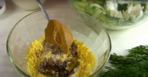 Dodaj je do pozostałych składników. Całość polej niewielką ilością soku z cytryny. Następnie dodaj do miski odrobinę soli, koperek oraz wybrane przez siebie zioła, a także śmietanę lub jogurt naturalny. Całość dokładnie wymieszaj. Gotowe!
