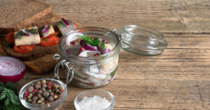 Śledź z dodatkiem cebulki w zalewie olejowej- pyszna przekąska, która każdemu posmakuje.