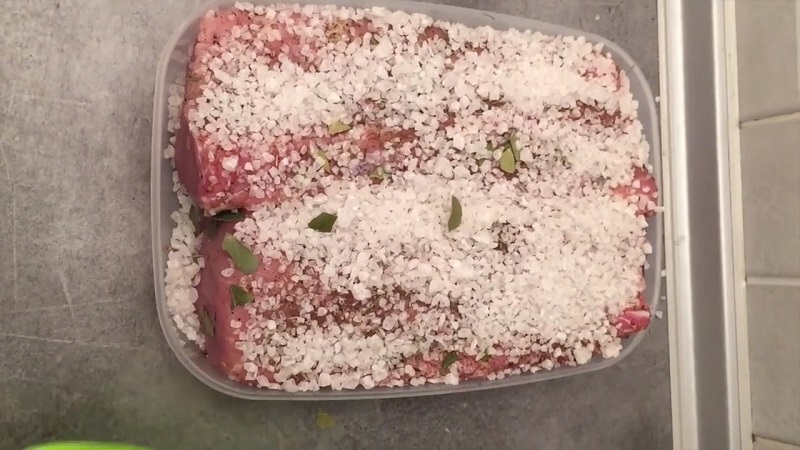 Po tym czasie wyjmujemy wieprzowinę z lodówki, płuczemy z soli pod bieżącą wodą i osuszamy papierowym ręcznikiem. Następnie ponownie nacieramy mięso mieszanką ziołową, nie dodajemy już soli. Tak przygotowane mięso owijamy w czystą, suchą gazę i kładziemy w lodówce lub chłodnym, wentylowanym miejscu na dwa tygodnie.