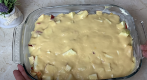 Jabłka polej masą. Szarlotkę piecz w 180 stopniach przez ok. 35 minut.