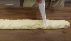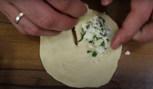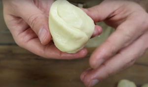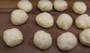 Podziel na równe kawałki. Z uformowanych kulek zrób placki do których włóż nadzienie. Po czym ponownie zrób kulki.