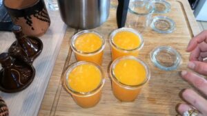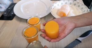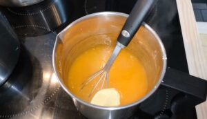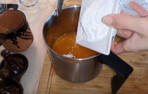 Potem mieszankę należy zdjąć z ognia i dodać do niego dużą łyżkę masła. Masę ponownie należy rozbić trzepaczką. Umyte i przygotowane wcześniej pojemniki na deser należy uzupełnić pozyskaną masą.