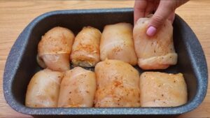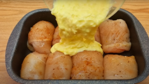 Roladki układamy w naczyniu żaroodpornym, wysmarowanym tłuszczem. W osobnej miseczce mieszamy jajko, jogurt, sól i resztę sera. Taką mieszanką zalewamy roladki i całość pieczemy około 30 minut, w 200 stopniach.