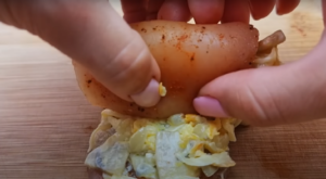 Połowę sera dodajemy do duszonych warzyw. Następnie dodajemy śmietanę i trochę soli do smaku. Mieszankę układamy na kawałkach kurczaka, które następnie zawijamy w roladki.