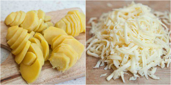 Naczynie żaroodporne lub formę do pieczenia dokładnie nasmaruj olejem. Ułóż w nim warstwowo plastry cebuli, następnie lekko rozbite mięso. Kolejno ułóż na wierzchu plastry ziemniaków w taki sposób, aby dokładnie pokryły mięso.