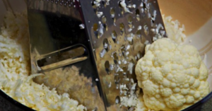 1. Za pomocą tarki zetrzyj cały kalafior. Przełóż go do miski, po czym dodaj do niego oregano, pieprz, sól jajka oraz drobno posiekany czosnek.