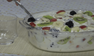 Owoce dokładnie umyć i pozostawić do wyschnięcia. Śmietanę zmiksować i dodać cukier waniliowy. W misce połączyć jogurt naturalny, twaróg i cukier. Owoce pokroić na małe kawałki, a następnie dodać je do bitej polewy. W dużej misce umieść warstwę twarogową. Następnie dodaj warstwę owocową.