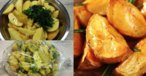 Dobrze wymieszaj, aby każdy ziemniak był pokryty składnikami. Należy je piec w temperaturze 180-190°C przez 40 minut. Czas pieczenia będzie się różnił w zależności od tego, jak duże są ziemniaki.